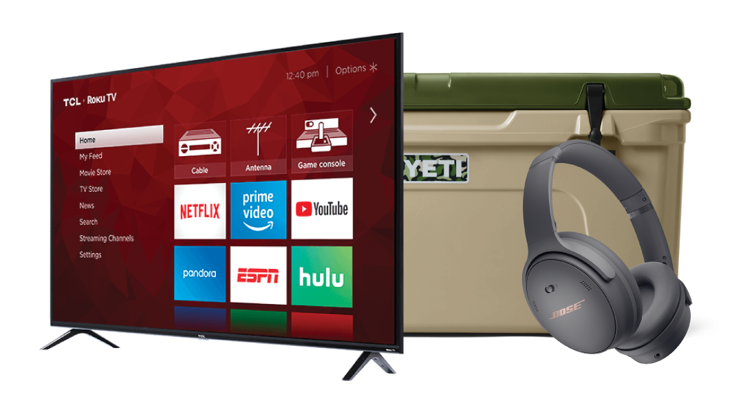 Bose Quiet Comfort 45 Headphones (limited edition eclipse gray), a 65” ROKU Select Series TV, and a Limited Edition YETI Tundra 65 Cooler (Color DECOY) Prizes may not be exchanged, substituted, transferred or redeemed for other prizes by winners. Cash will not be awarded as a substitute prize. Prizes are awarded ‘as is’ with no guarantees or warranties as to use, merchantability, or fitness for a specific purpose, and the Sponsor is not responsible for defective prizes. Other terms and conditions may apply.